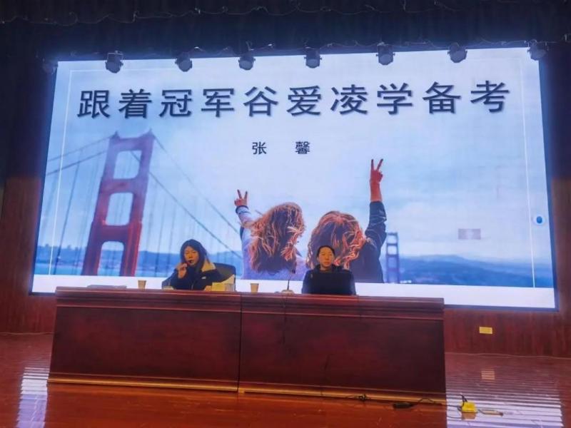 今天在报告厅举行了备考心理励志主题讲座活动。张老师带领我们《跟着冠军谷爱凌学备考》。本次讲座活动内容丰富多彩,体验感强。整个过程使我身心放松,对期末接下来的学习生活充满了信心与力量。