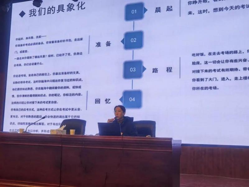 张老师从“具象化”“学会调整”“正确面对压力”三个方面对我们进行了辅导。其中令我印象最深的是“具象化”实景体验。闭上眼睛,听着张老师温柔的声音,我仿佛真的到了考试那天,并顺利完成了考试。通过本次讲座,我意识到考前有压力、有恐惧,都是正常的,我们要找到适当的方法调整,勇敢面对,在每一次挑战中发挥最佳水平。