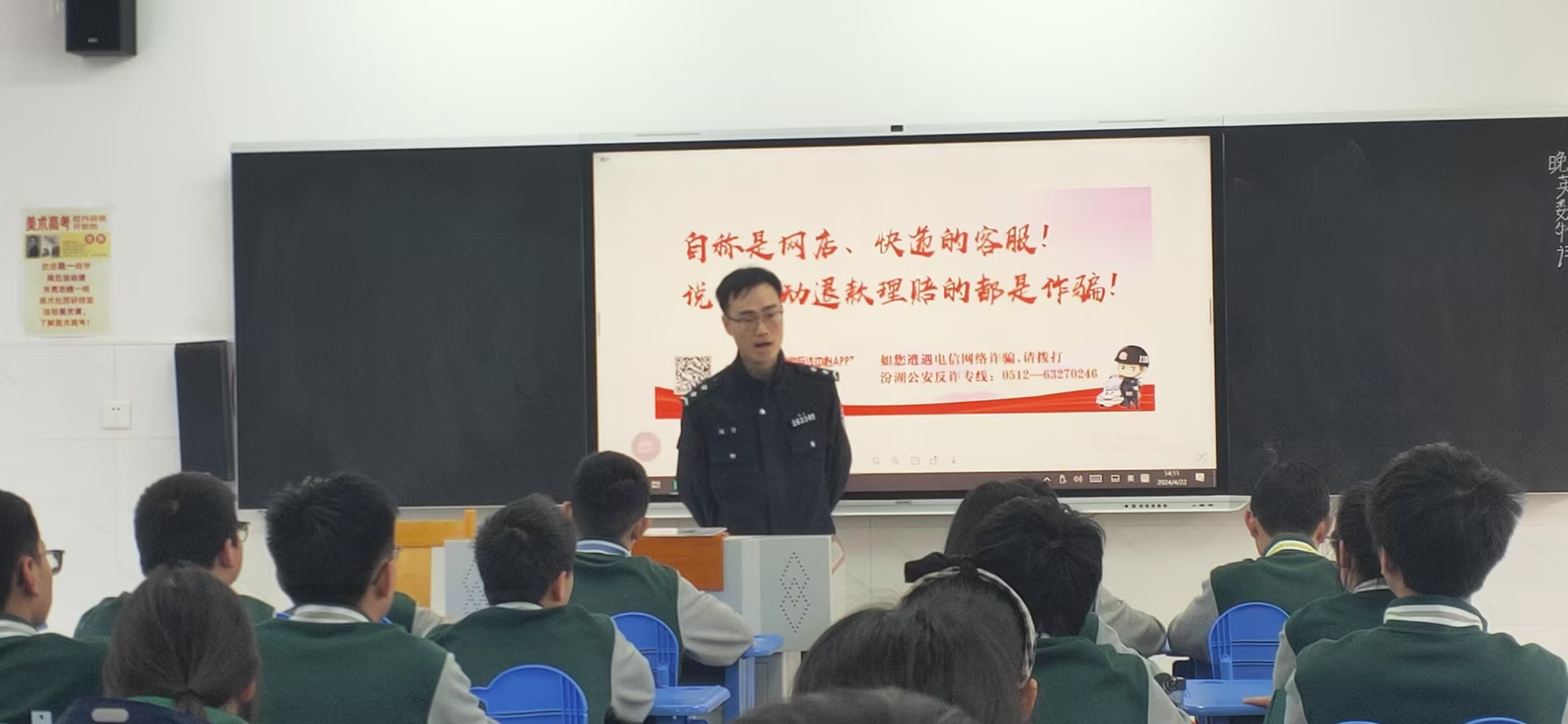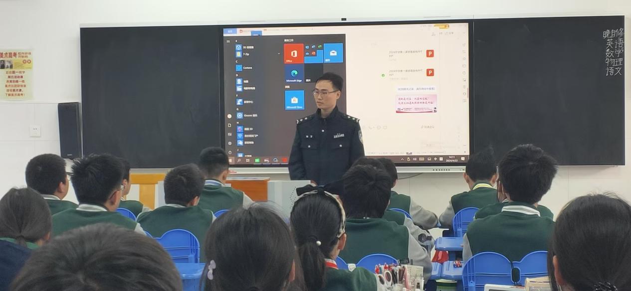 2024年4月22日,吴江汾湖派出所利用主题班会的形式到我校进行禁毒反诈宣传,高一14班学生聚精会神聆听警官们的禁毒反诈宣传,对毒品的危害有了深入的了解,对社会上诈骗行为有了一定的防范意识。