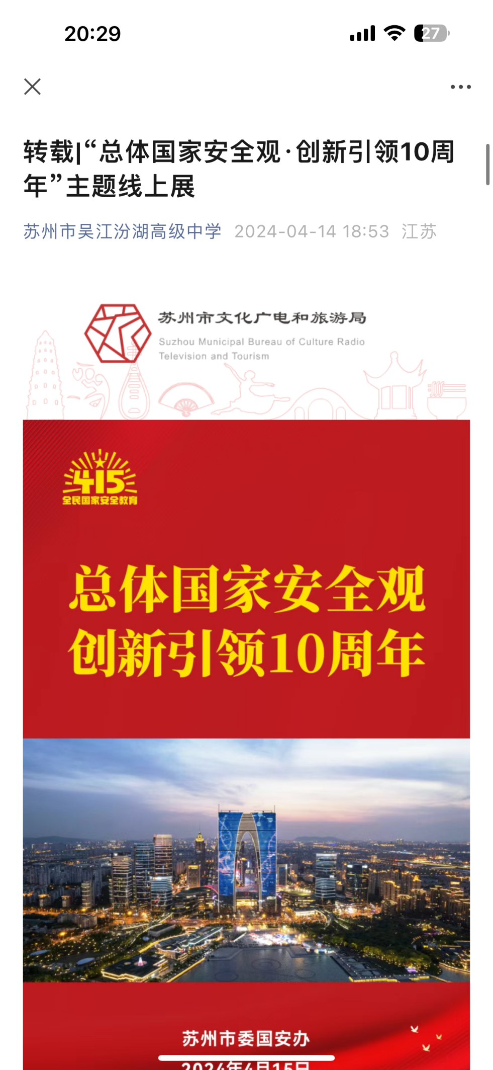 4、学校微信公众号在4月14日、15日分别转载《“总体国家安全观·创新引领10周年”主题线上展》《苏州市国家安全宣教片
