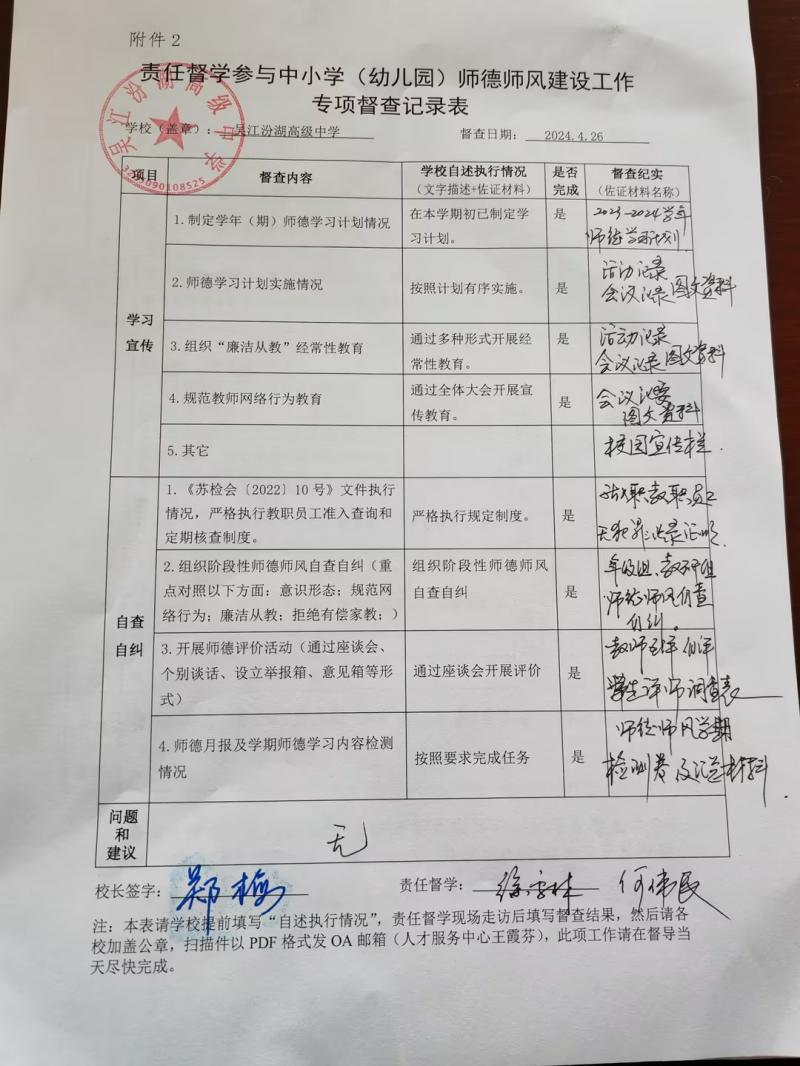 其中“师德师风”为本月督查重点工作,督查时请各责任区督学认真核实,各项内容填写完整后,请各校加盖公章,扫描件以PDF格式发人师科王霞芬OA邮箱,纸质表留校保存备查。
