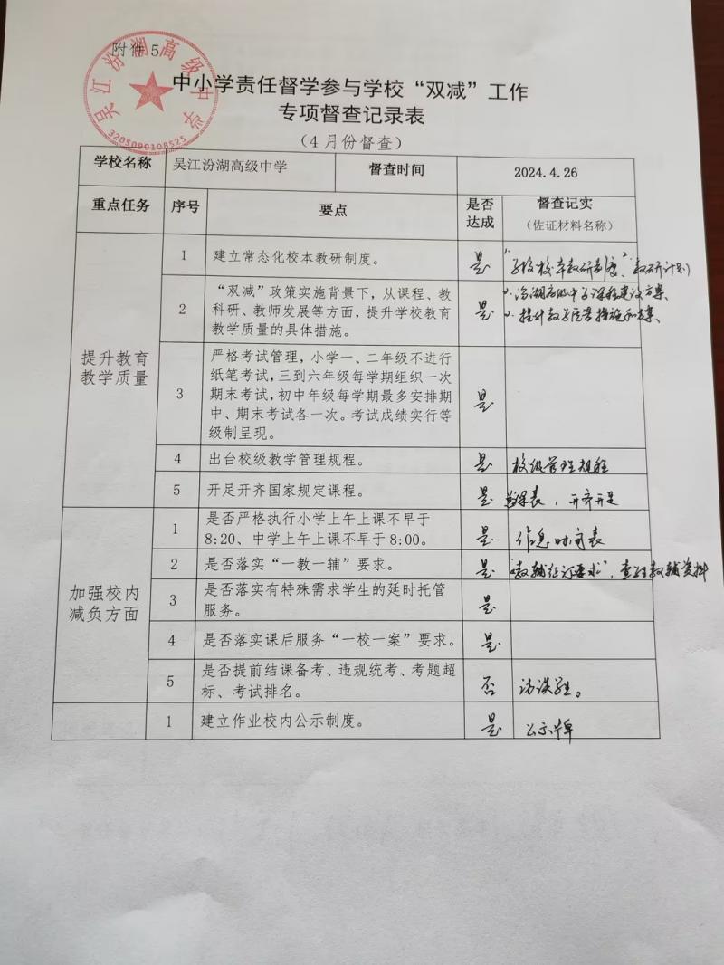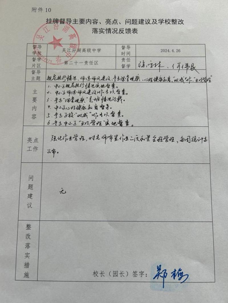 4月26日上午,根据上级教育督导工作安排,结合区域教育工作重点,吴江区教育局徐雪林、何伟民两位督学对汾湖高中进行菜单式挂牌督导。本次挂牌督导工作部署如下: