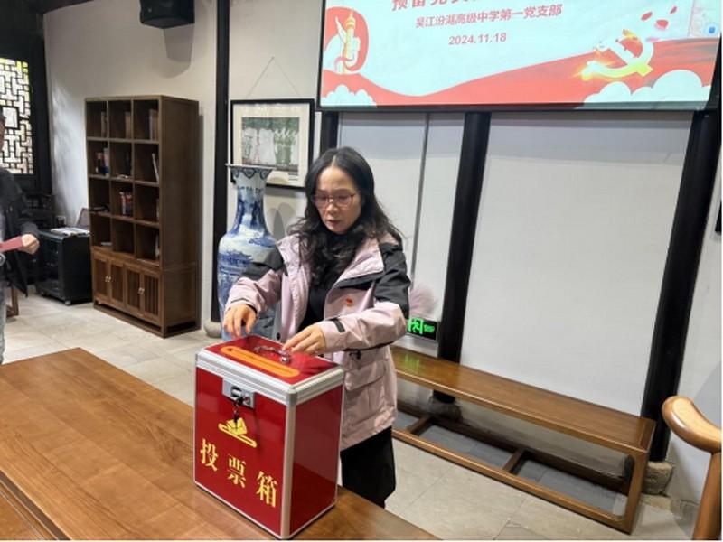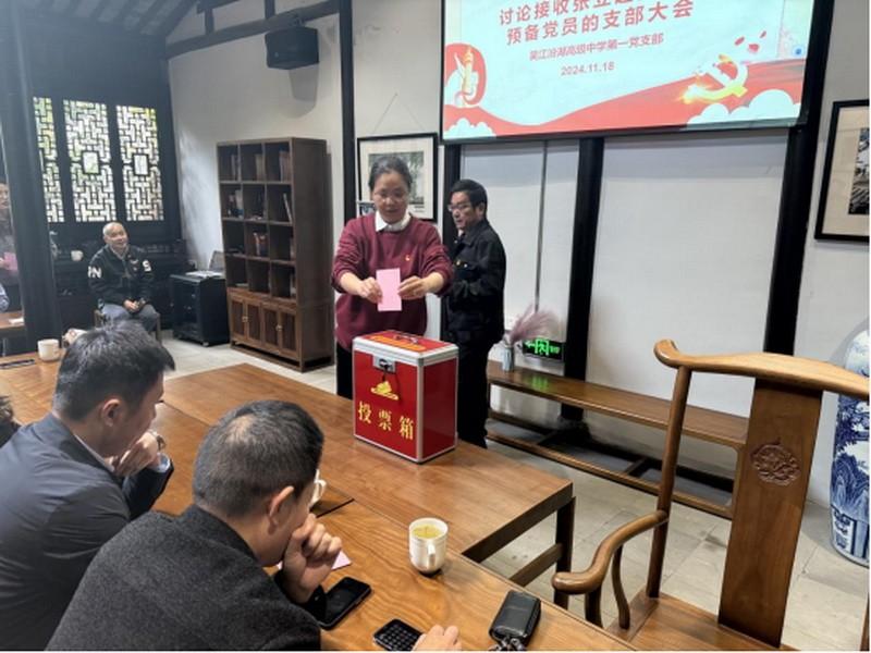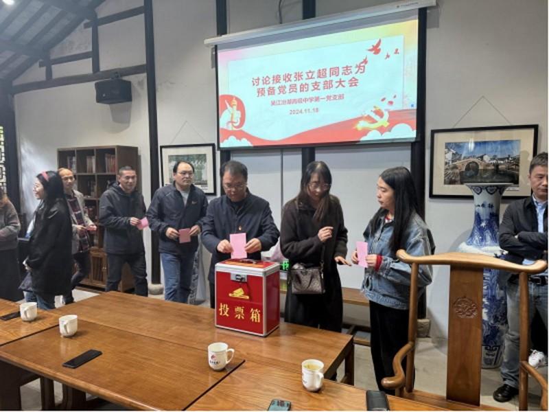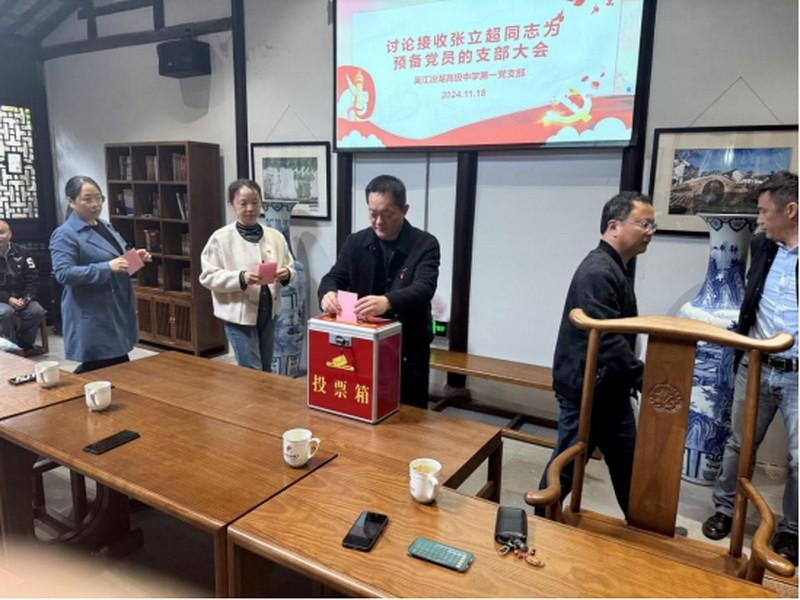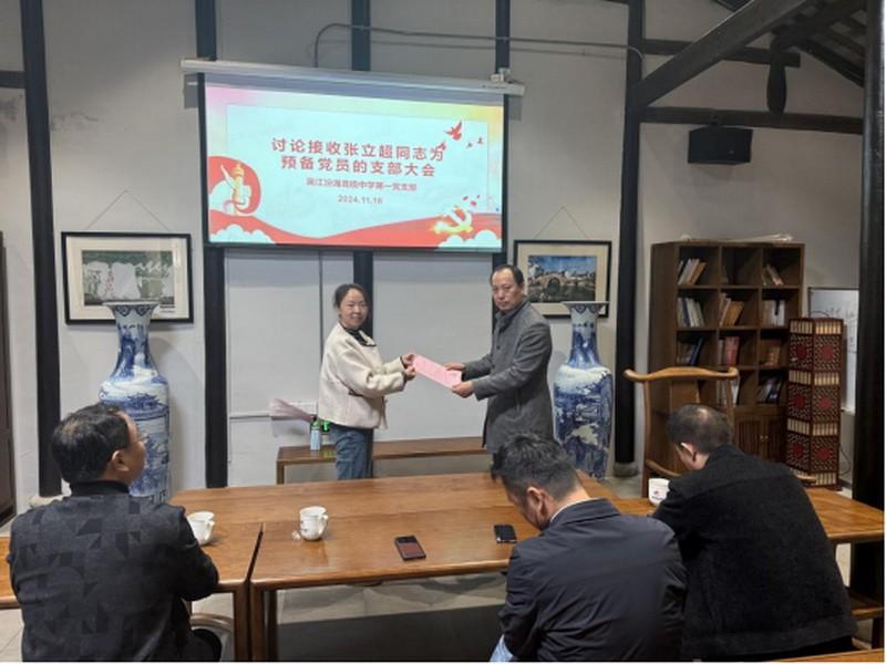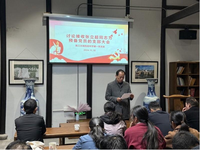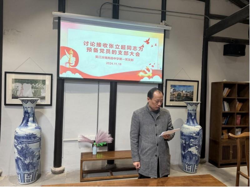 2024年11月18日,吴江汾湖高级中学举办了一场预备党员接受活动活动,讨论接收张立超同志为预备党员。全体参与活动的党员及非党员教师们在黎里镇黎轩书院内济济一堂。在书院内,张立超老师首先为大家详细介绍了自己的入党流程,分享了自己从一名普通教师成长为共产党员的心路历程。他的讲述生动感人,让在场的每一位老师都深受触动,更加坚定了自己的初心和使命。