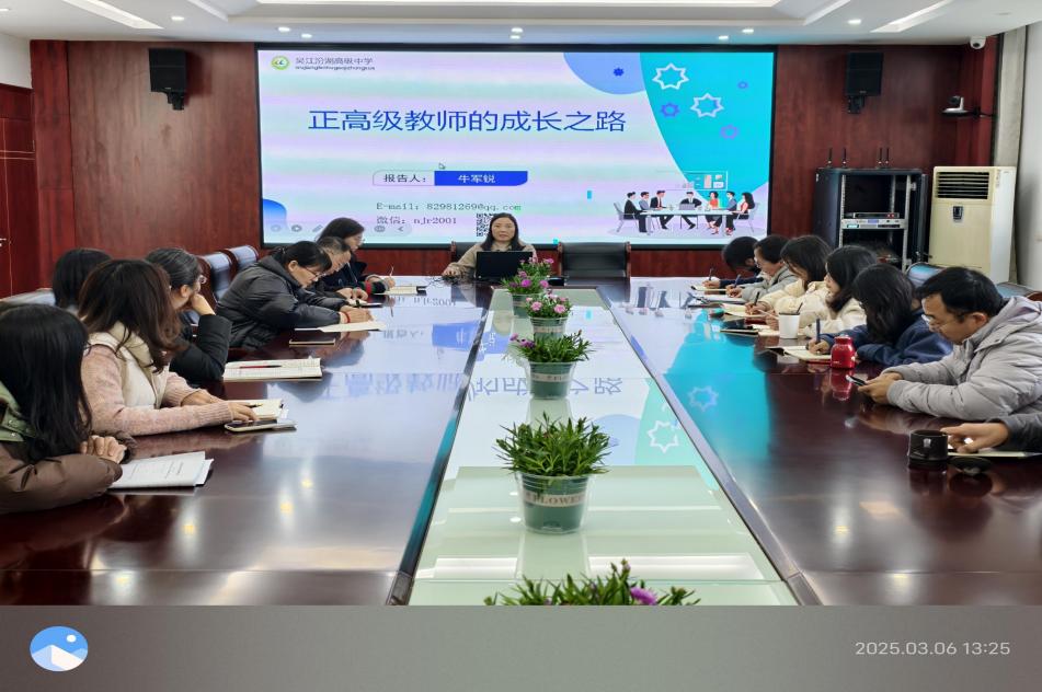 活动中,牛军锐老师展示了她精心制作的PPT---《正高级教师的成长之路》,分享了自己的晋级经验,她强调了录课评课、技能比赛、专业阅读、试卷命制和课题研究对于青年教师自身发展的重要意义,同时提到青年教师身心健康对于专业发展的必要性。牛军锐老师还分享了她从教以来逐步成长为骨干教师的宝贵经验。首先是成长的基石——备课,她认为备课有三宝:通读课标、钻研教材、研究学情。年轻教师最大的弱项是课堂教学把控不好,参加教课比赛既是对青年教师的一种磨练和激励,也是快速提高教学水平和课堂效果的一种方法。其次是成长的捷径——听课与赛课。牛老师向大家展示了如何上好一节优质课,她认为一定要观摩名师优质课,撰写教学设计,设计好过渡语,注重教学互动,注重教学反思。牛老师的分享带着满满的干货,既实用,又引人深思,让在场的教师们受益匪浅,大家前进的方向也更加明朗了。