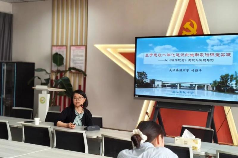 评课结束之后,高级中学的叶绕平老师作了《基于思政一体化建设的生动政治课堂实践——以<法治政府>的设计实践为例》的讲座,叶老师从“思政一体化的顶层设计”、“思政一体化的教学设计”、“思政一体化的教学实施”三个维度,并结合《法治中国》的设计实践,讲述了自身对思政一体化背景下生动政治课堂的一点思考和实践,同时主张“课堂教学是‘生动’的主渠道”,上“走心的思政课”!