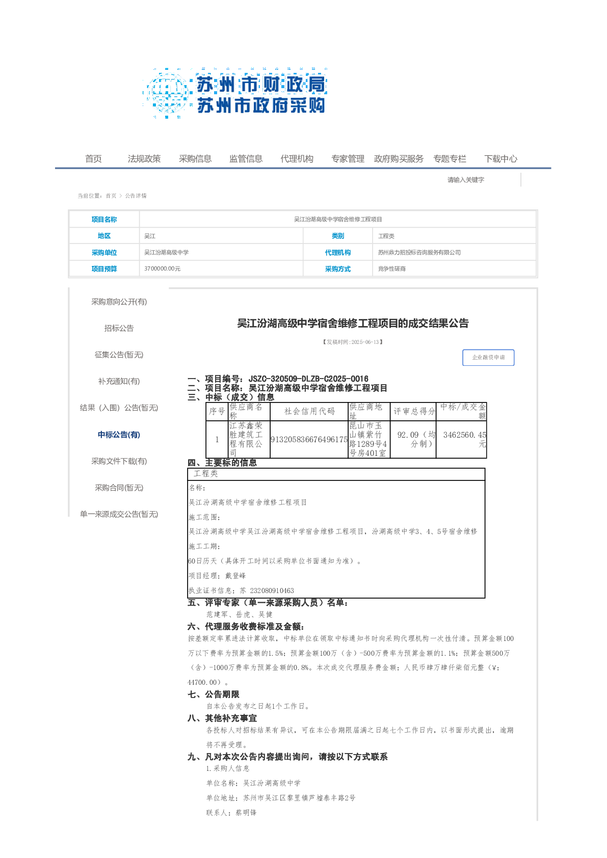 吴江汾湖高级中学宿舍维修工程项目的成交结果公告
