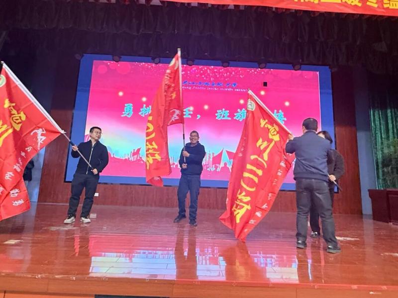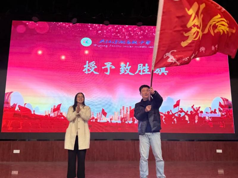 最后郑梅校长为本届高三授予致胜旗,马华峰副校长接过了象征本届高三旗开得胜的致胜旗,以期在未来的奋战中坚定信念,创造奇迹!