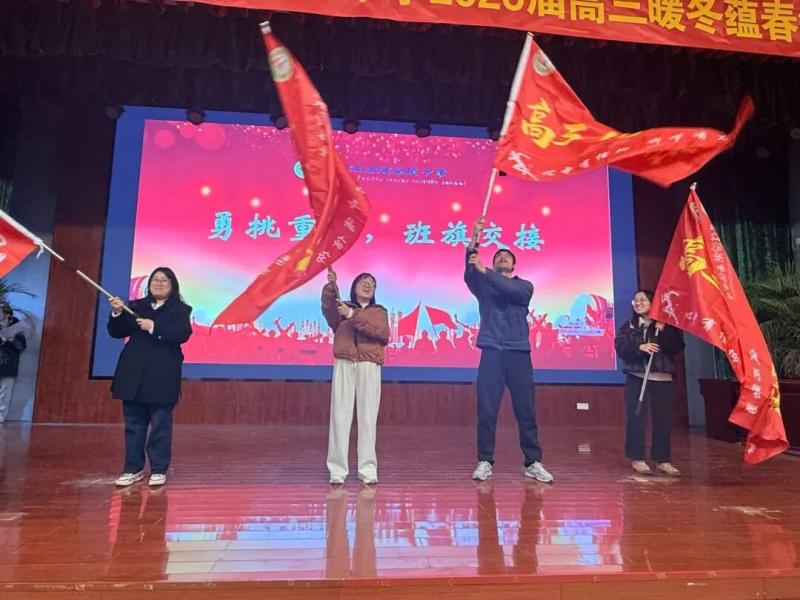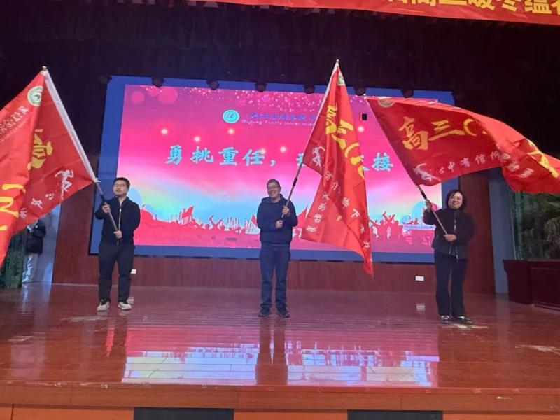 王孙斌副校长、张道致副校长、钱雪松副校长、马华峰副校长分别给高三各班级授予了班旗。各班班主任接班旗,挥旗,合影留念。这一刻,班级荣誉感与责任感油然而生。背景音乐响起,为这个庄重而神圣的时刻增添了一份激动人心的氛围。