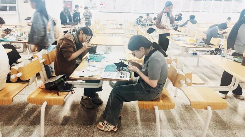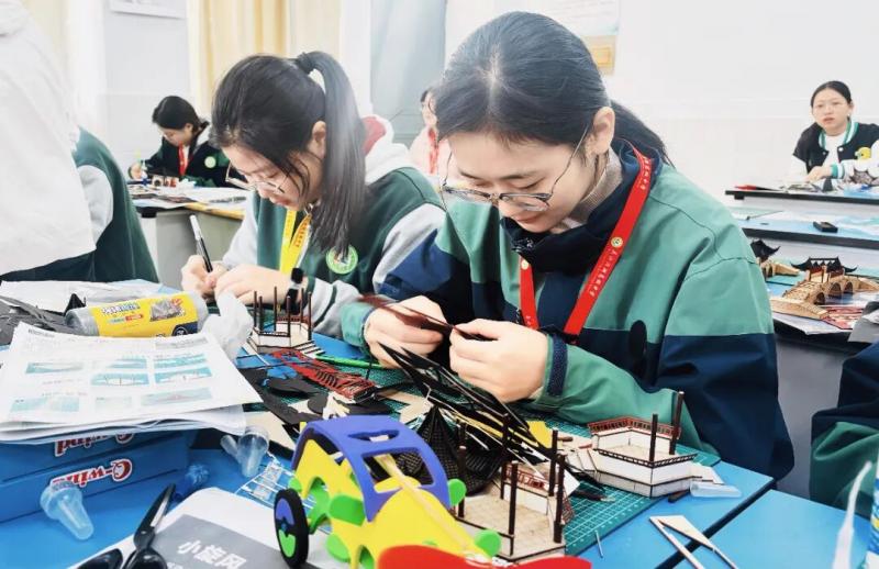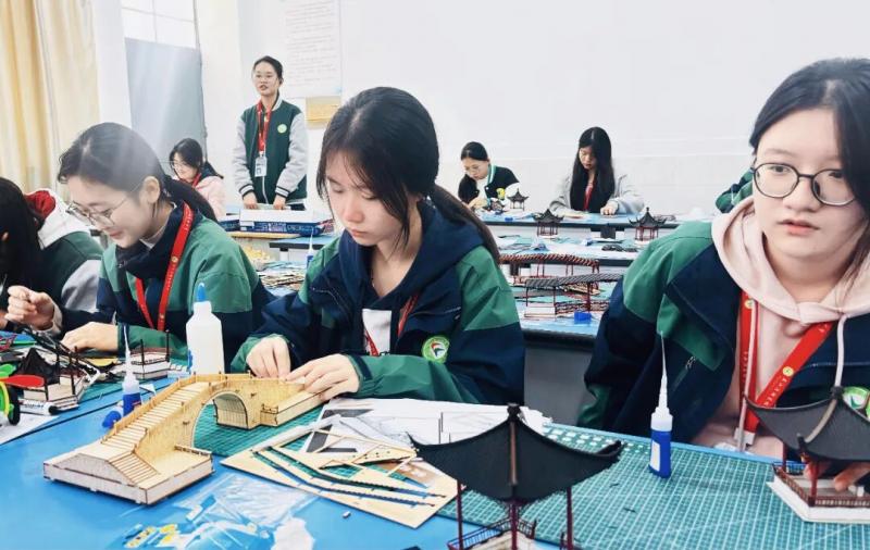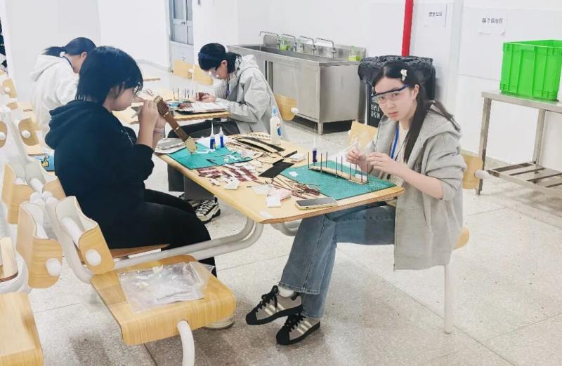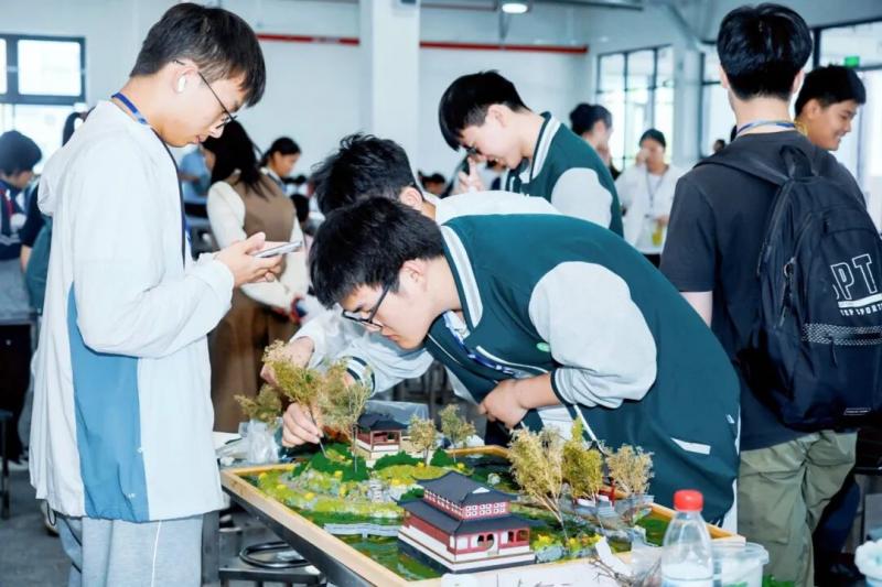 相较于室外的激烈竞速,建筑模型赛场则是一片静谧而专注的天地。在这里,时间仿佛慢了下来,我校选手们化身能工巧匠,专注于手中的“一砖一瓦”。