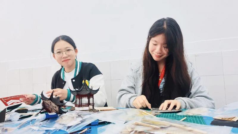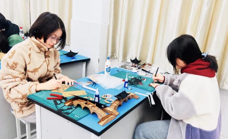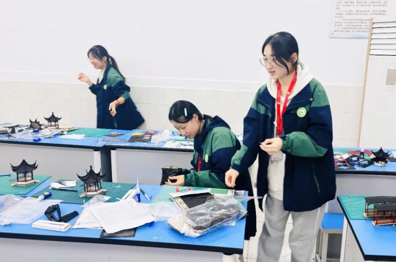 赛前,孩子们精心准备,一张张书桌变身“微缩工坊”。切割薄木塑飞檐,雕琢泡沫成奇石,粘贴仿真黛瓦,铺设蜿蜒“石径”,点缀盎然“绿意”。